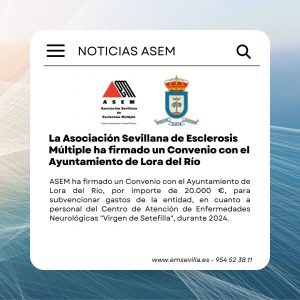 La Asociación Sevillana de Esclerosis Múltiple ha firmado un Convenio con el Ayuntamiento de Lora del Río, por importe de 20.000 €, para subvencionar gastos de la entidad, en cuanto a personal del Centro de Atención de Enfermedades Neurológicas “Virgen de Setefilla”, durante 2024.