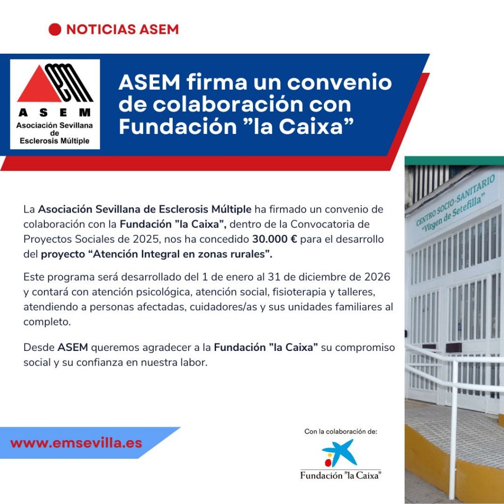La Asociación Sevillana de Esclerosis Múltiple ha firmado un convenio de colaboración con la Fundación ”la Caixa”, dentro de la Convocatoria de Proyectos Sociales de 2025, nos ha concedido 30.000 € para el desarrollo del proyecto “Atención Integral en zonas rurales”.