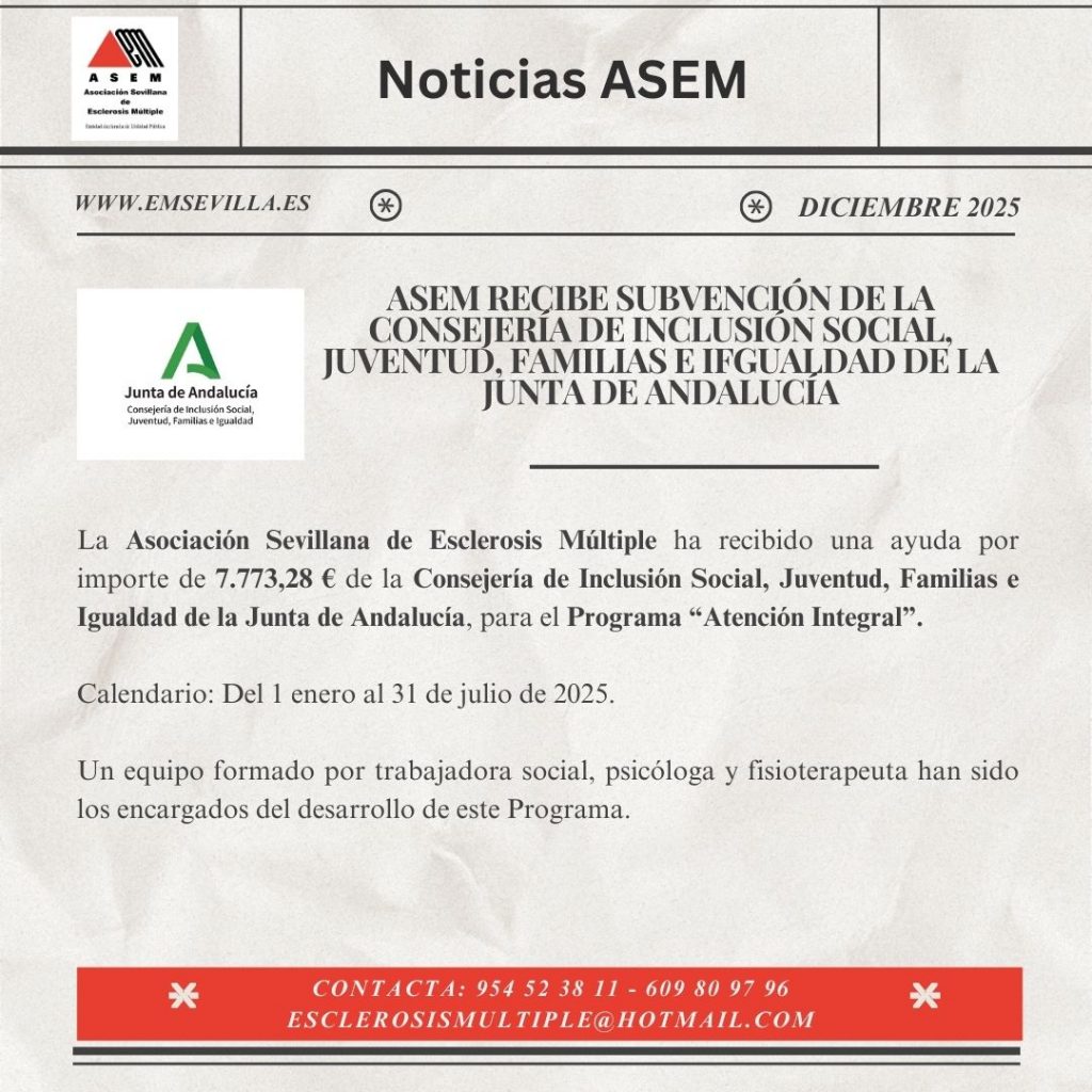 La Asociación Sevillana de Esclerosis Múltiple ha recibido una ayuda por importe de 7.773,28 € de la Consejería de Inclusión Social, Juventud, Familias e Igualdad de la Junta de Andalucía, para el Programa “Atención Integral”.