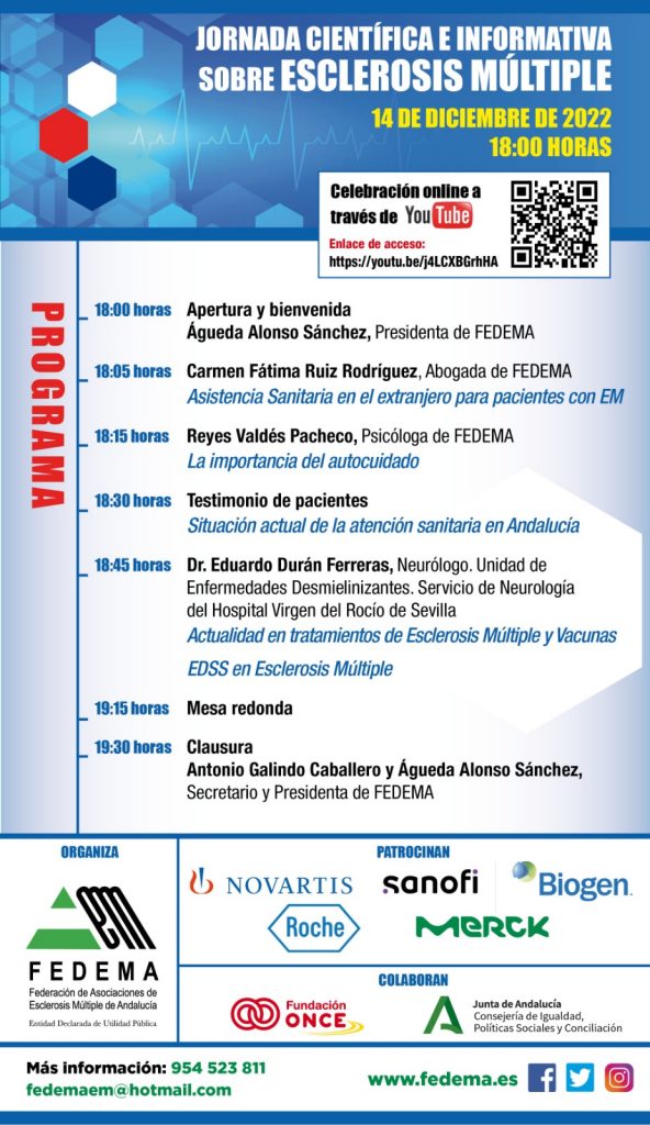 Jornada Científica e Informativa sobre EM, de FEDEMA, miércoles 14 de diciembre a las 18:00 h, a través del canal de YouTube de FEDEMA.