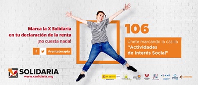 Estamos en el momento en el que las personas contribuyentes presentan su declaración de la Renta. Desde la ONG (nombre entidad) se invita a todas las personas a marcar la casilla 106 de Actividades de Interés Social y a decidir, con este gesto solidario, el destino de una pequeña parte de sus impuestos con el que se ayuda a 7 millones de personas que lo necesitan. Marcar la casilla 106 no cuesta nada, ya que la persona contribuyente no paga más ni le devuelve menos. Además, también puede marcar la casilla de Casilla de Actividades de Interés Social junto con la casilla de la Iglesia Católica y destinar un 0,7% de cada una de ellas. Por ello, este año animamos a todas las personas a marcar la X Solidaria y a practicar la Rentaterapia, el ejercicio que sienta bien a la persona contribuyente y a los 7 millones de personas que lo necesitan.