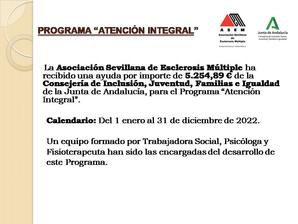 La Asociación Sevillana de Esclerosis Múltiple ha recibido una ayuda por importe de 5.254,89€ de la Consejería de Inclusión, Juventud, Familias e Igualdad de la Junta de Andalucía, para el Programa “Atención Integral”.