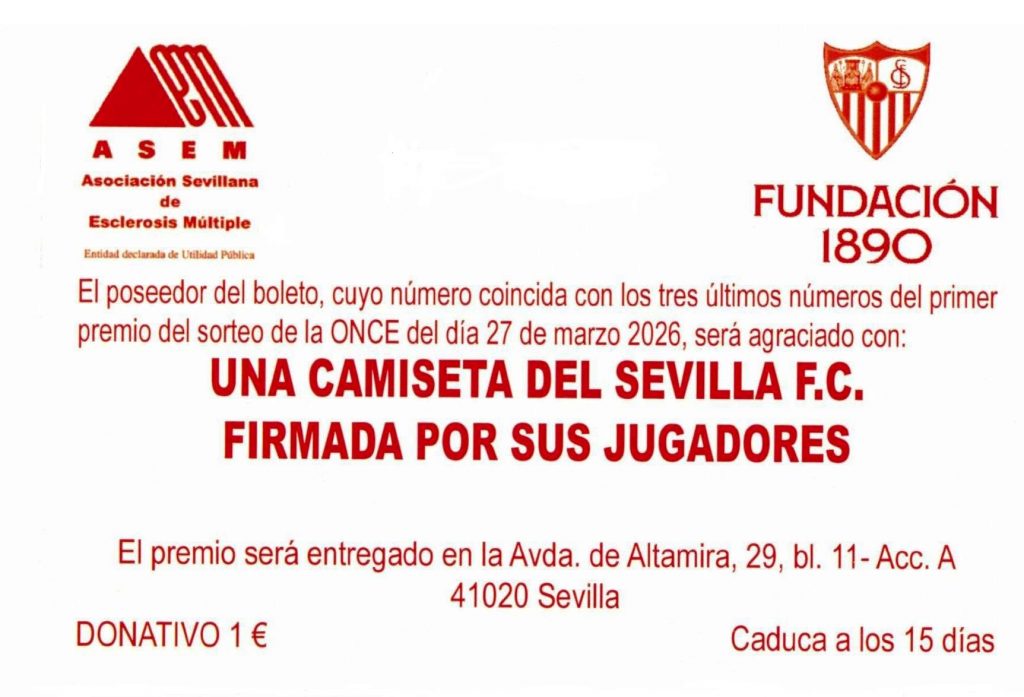 ¡Consigue tu camiseta del SEVILLA FC firmada por sus jugadores! Por tan sólo 1 € puedes participar en el sorteo, cuantas más compres más posibilidades tendrás. ¿Y si te toca?